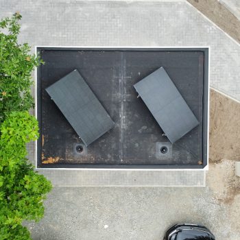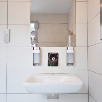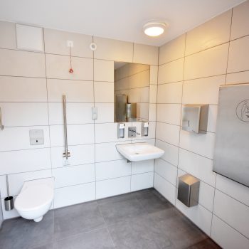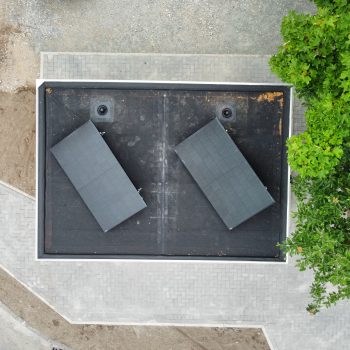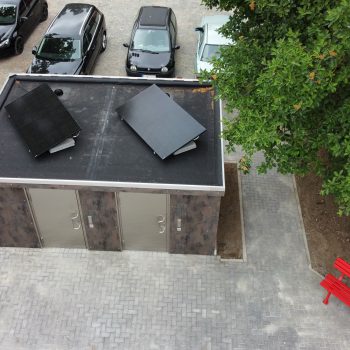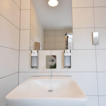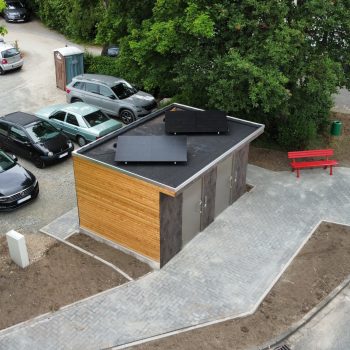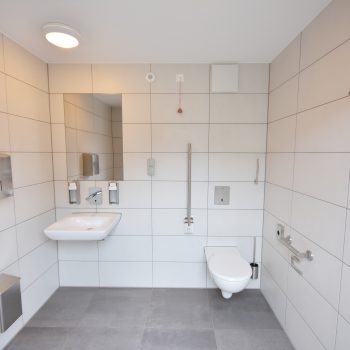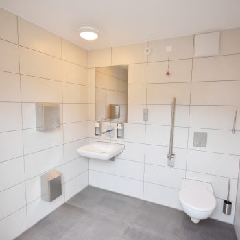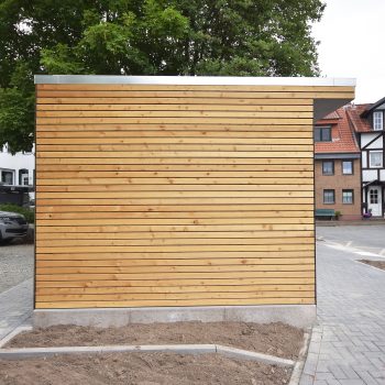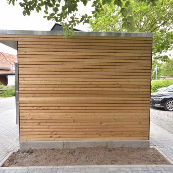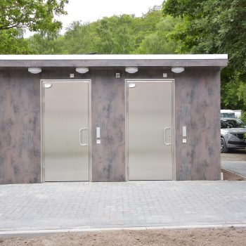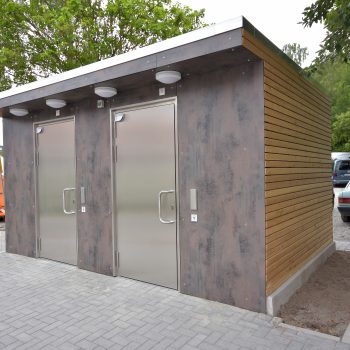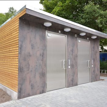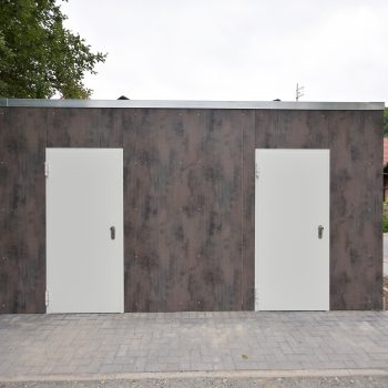 Die im Werk schlüsselfertig hergestellten WC-Anlagen bestehen aus 50mm Starken Leichtbetonwänden und können mit jeder Art von Außenfassade kombiniert werden.