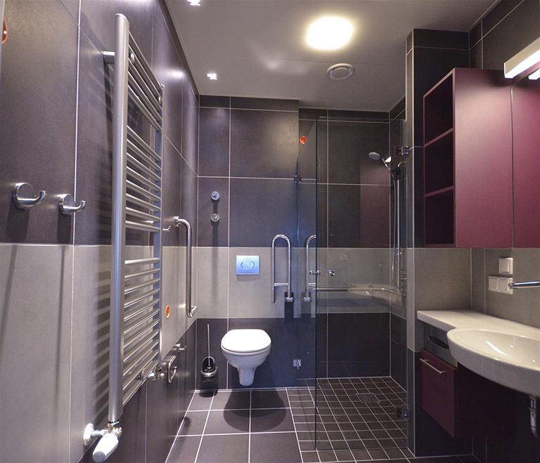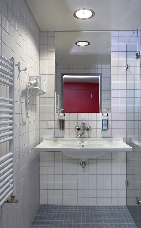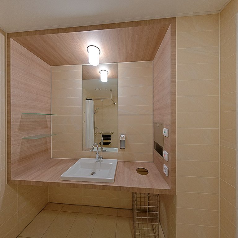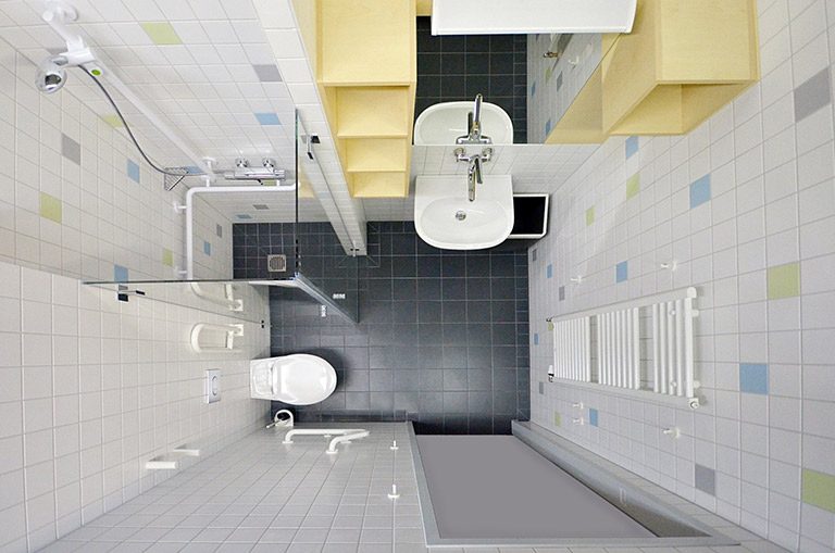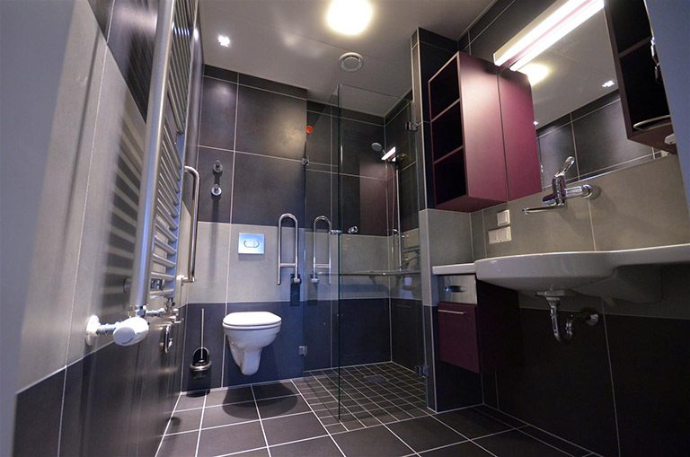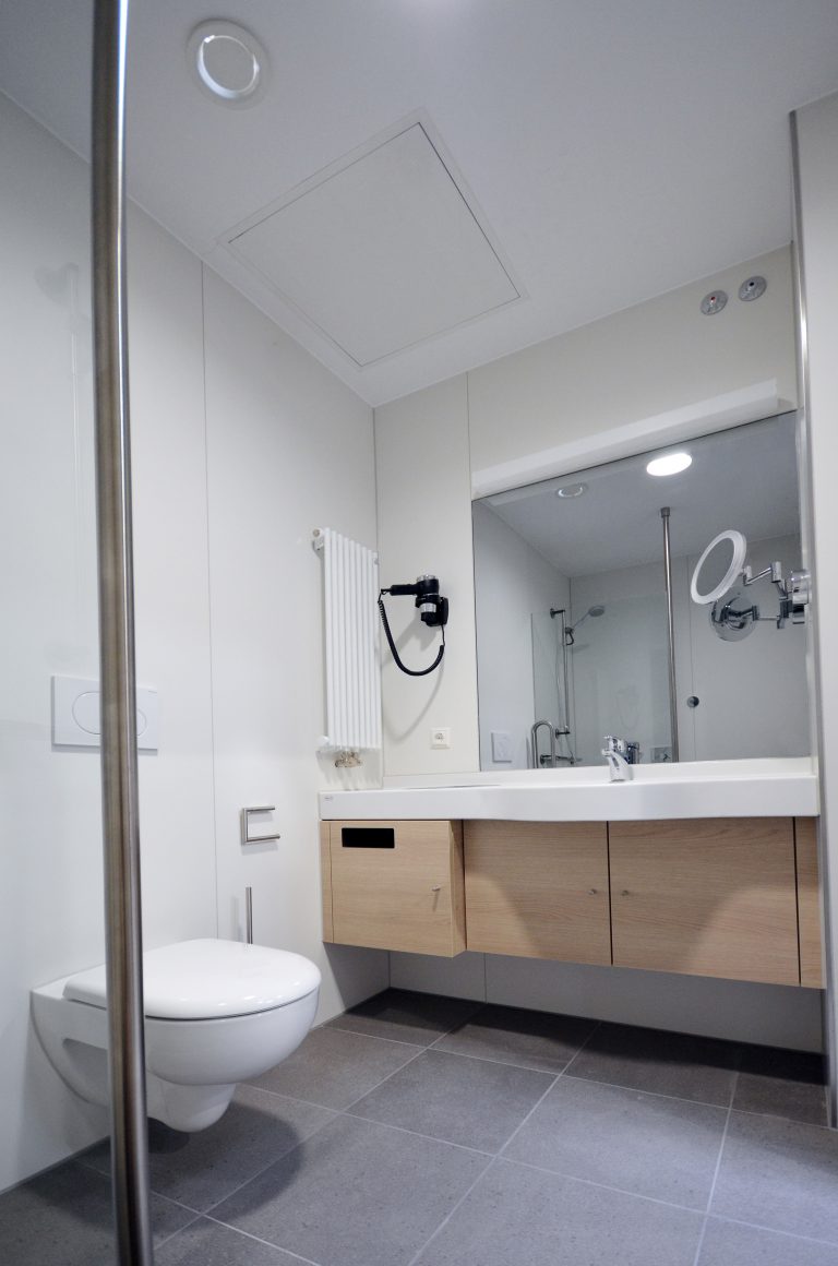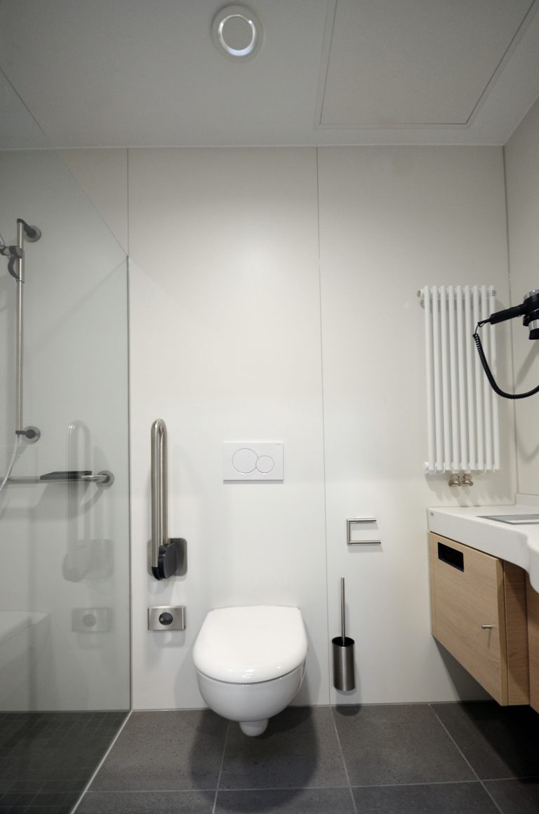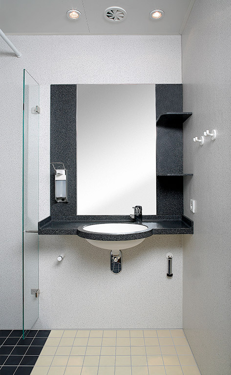 Die elementierte Sanitärzelle besteht aus vorgefertigten Einzelteilen, die vor Ort montiert werden. Das kompakte Fertigbad wird in unserer Produktion komplett fertig gestellt und schlüsselfertig in den Baukörper eingefügt.