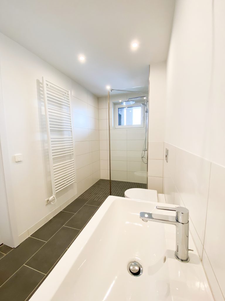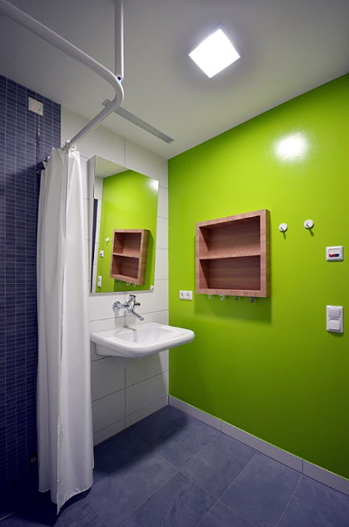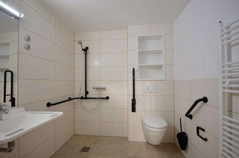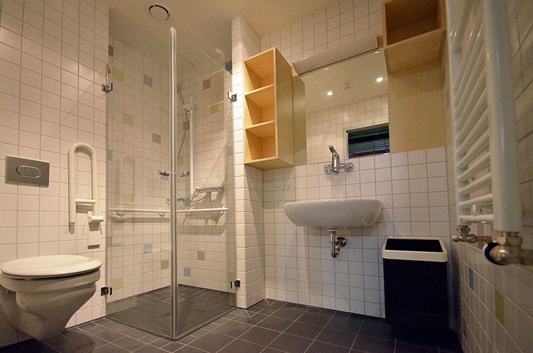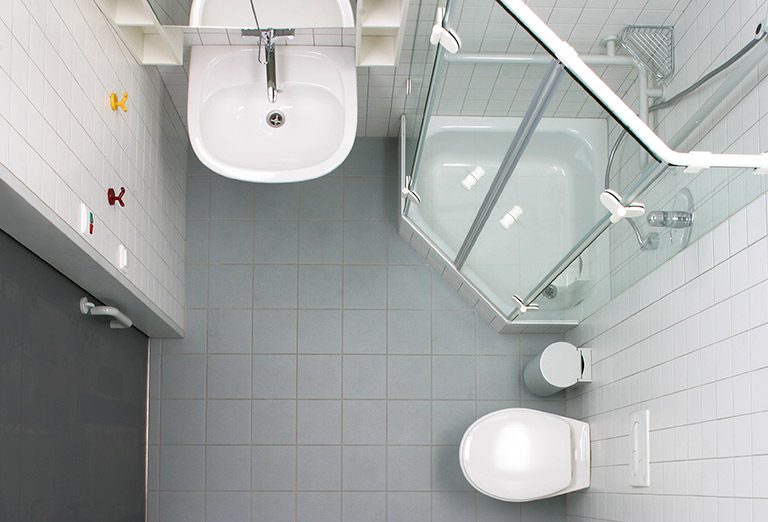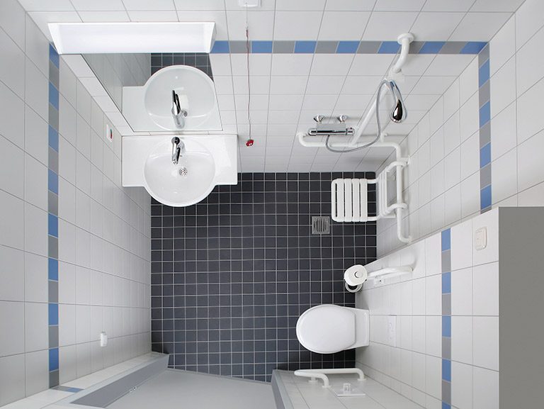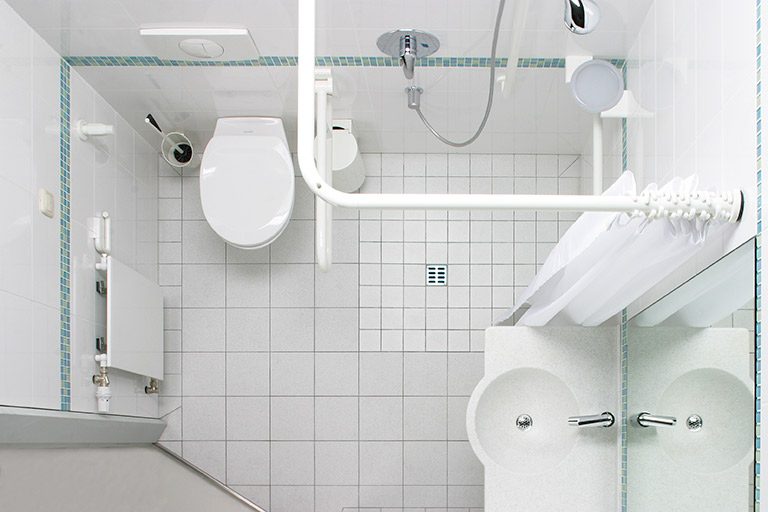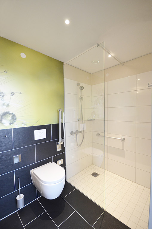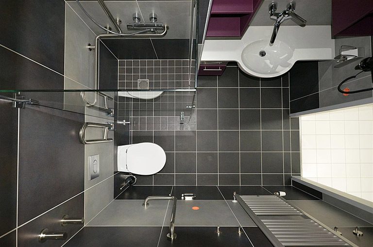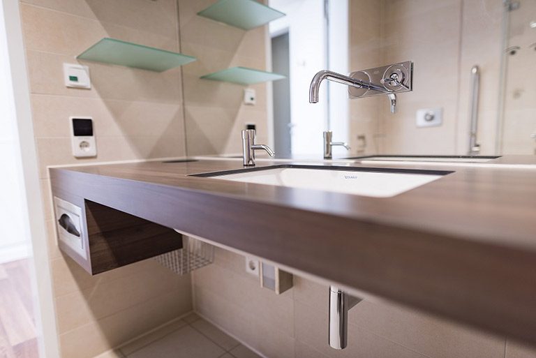 Die elementierte Sanitärzelle besteht aus vorgefertigten Einzelteilen, die vor Ort montiert werden. Das kompakte Fertigbad wird in unserer Produktion komplett fertig gestellt und schlüsselfertig in den Baukörper eingefügt.